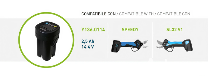 - Autonomia Prolungata: Con una capacità di 2,5 Ah, assicura un numero elevato di cicli di carica e scarica e un’autonomia che può superare le 2-3 ore di potatura (con Speedy o SL32 V1).